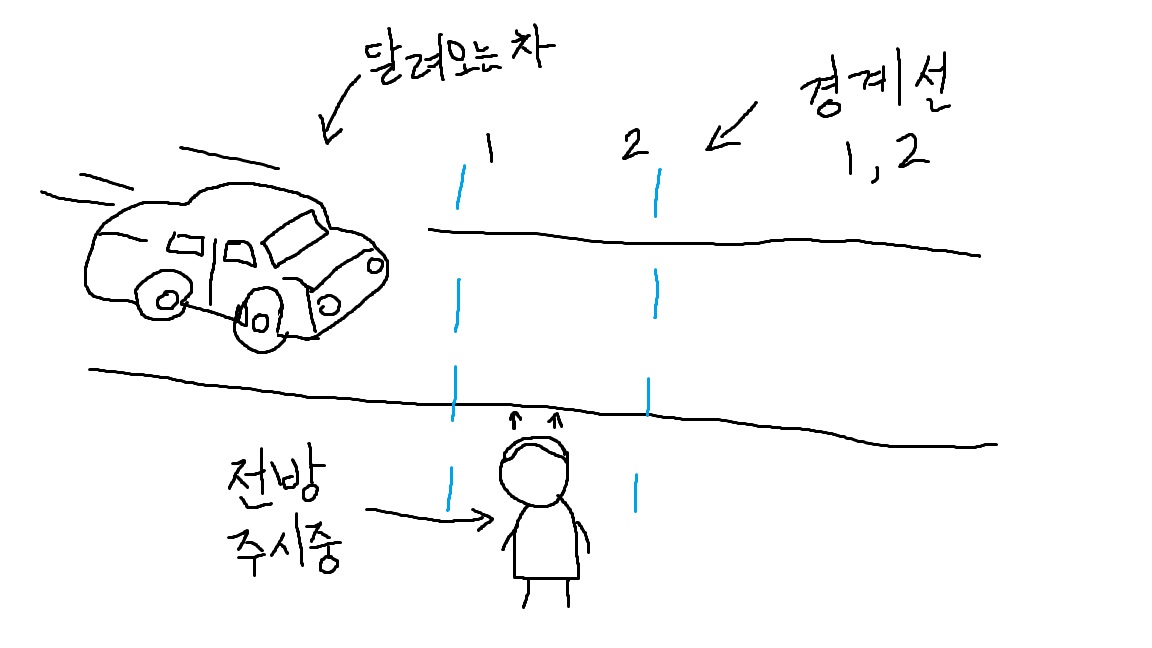 Á¦ ¾ÕÀ» Áö³ªÃİ¡±âÀü¿¡ "°æ°è¼±1" ¿¡¼ Â÷ÀÇ º»Ã¼°¡ ³Ñ¾î°¡´Â½ÃÁ¡ºÎÅÍ "°æ°è¼±2" »çÀ̱îÁö´Â "Űº¸µåÀÇ 1¹ø"À» ´©¸£´Â »óÅ·ΠÀÖ´Ù°¡,